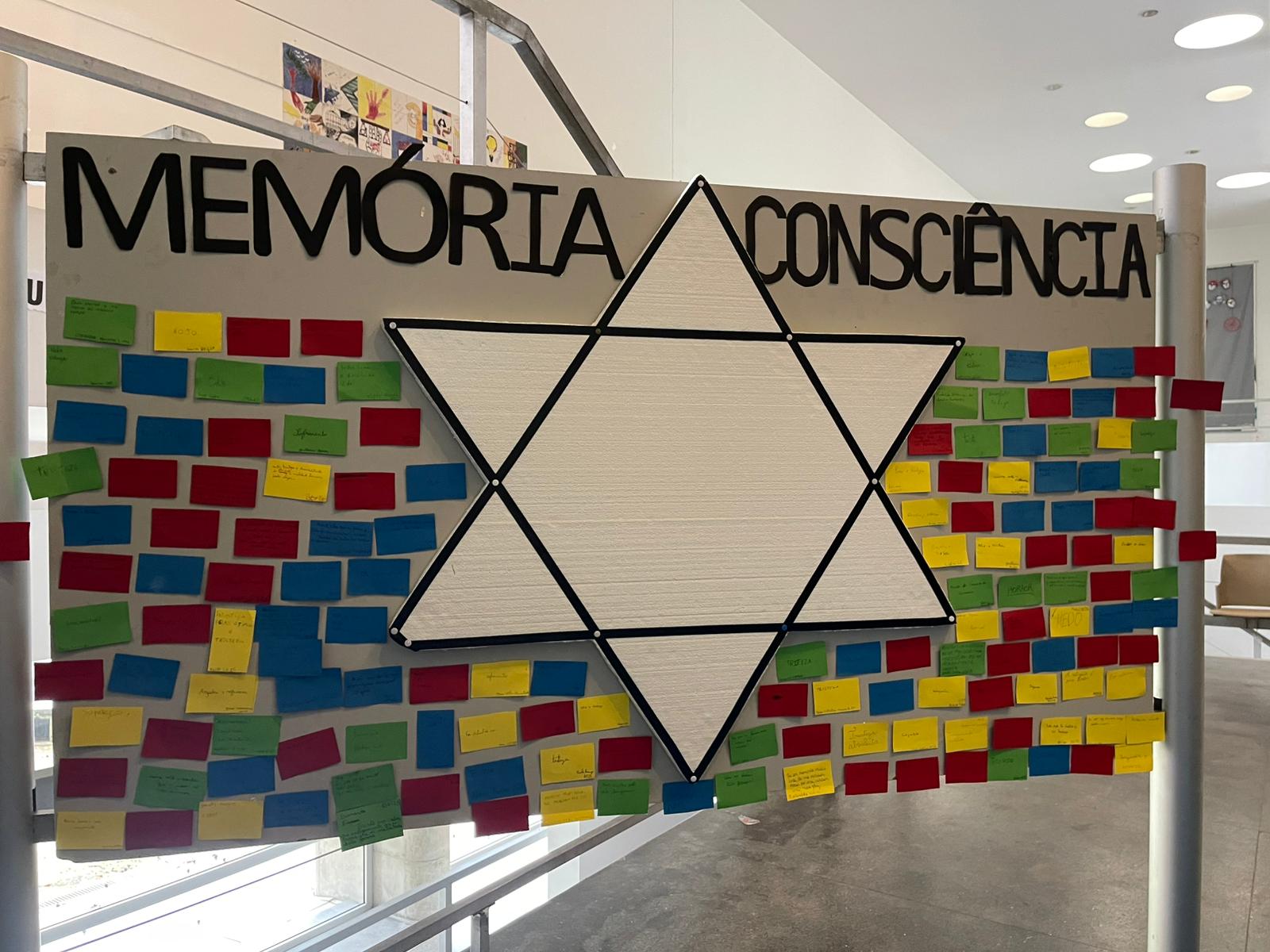No final da sessão, os alunos foram convidados a partilhar, por escrito, as emoções e reflexões despertadas pelos testemunhos e imagens visualizadas. A partir dessas mensagens, foi construído um mural coletivo, dando voz aos sentimentos de choque, empatia e reflexão suscitados pelos horrores perpetrados pelo regime nazi.