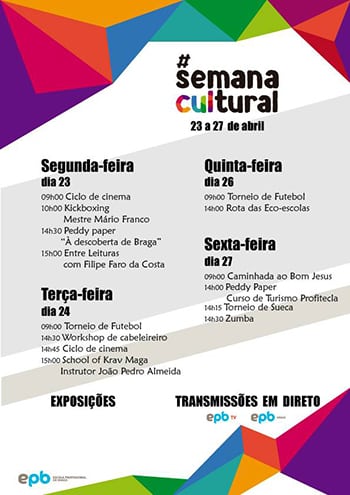De 23 a 27 de abril, decorreu a Semana Cultural da EPB, repleta de atividades dinamizadas por alunos e parceiros da EPB, que contribuem para o enriquecimento cultural e a saúde e bem-estar da comunidade escolar. Este ano, o certame é organizado pelas alunas Mariana Gomes e Nicole Rodrigues, finalistas do Curso Técnico de Secretariado, que decidiram abraçar este projeto a título de componente prática da sua Prova de Aptidão Profissional.